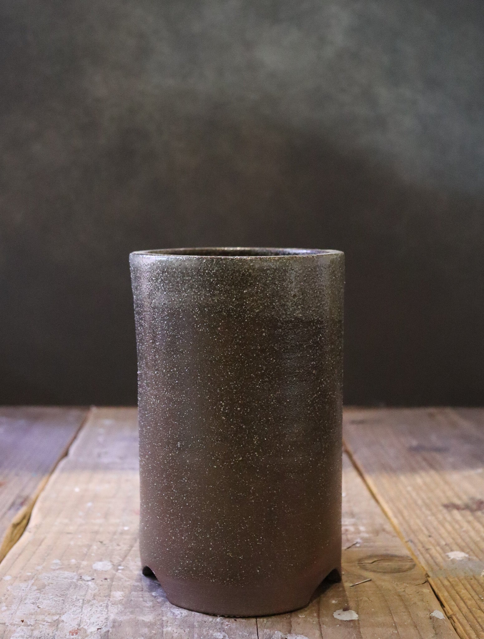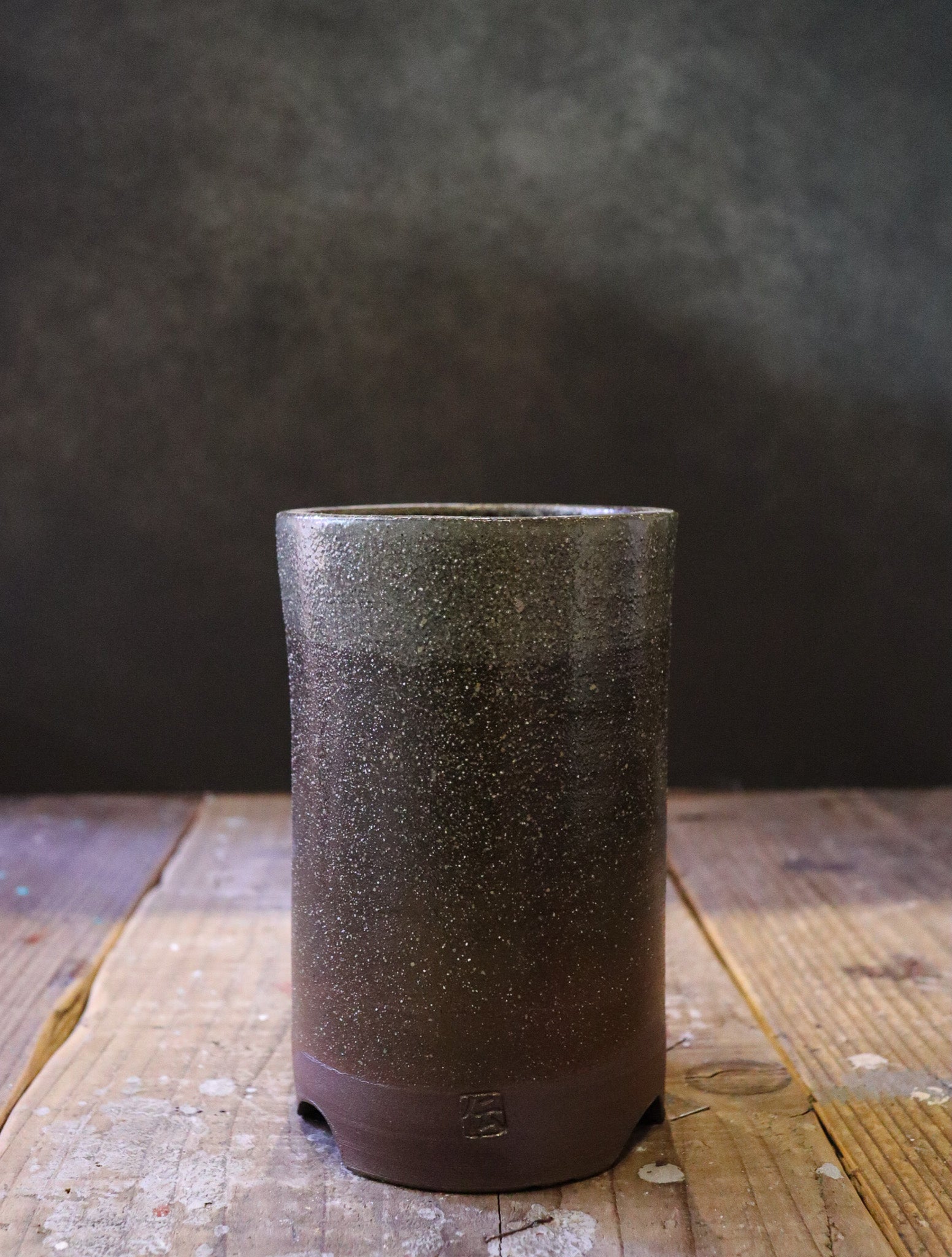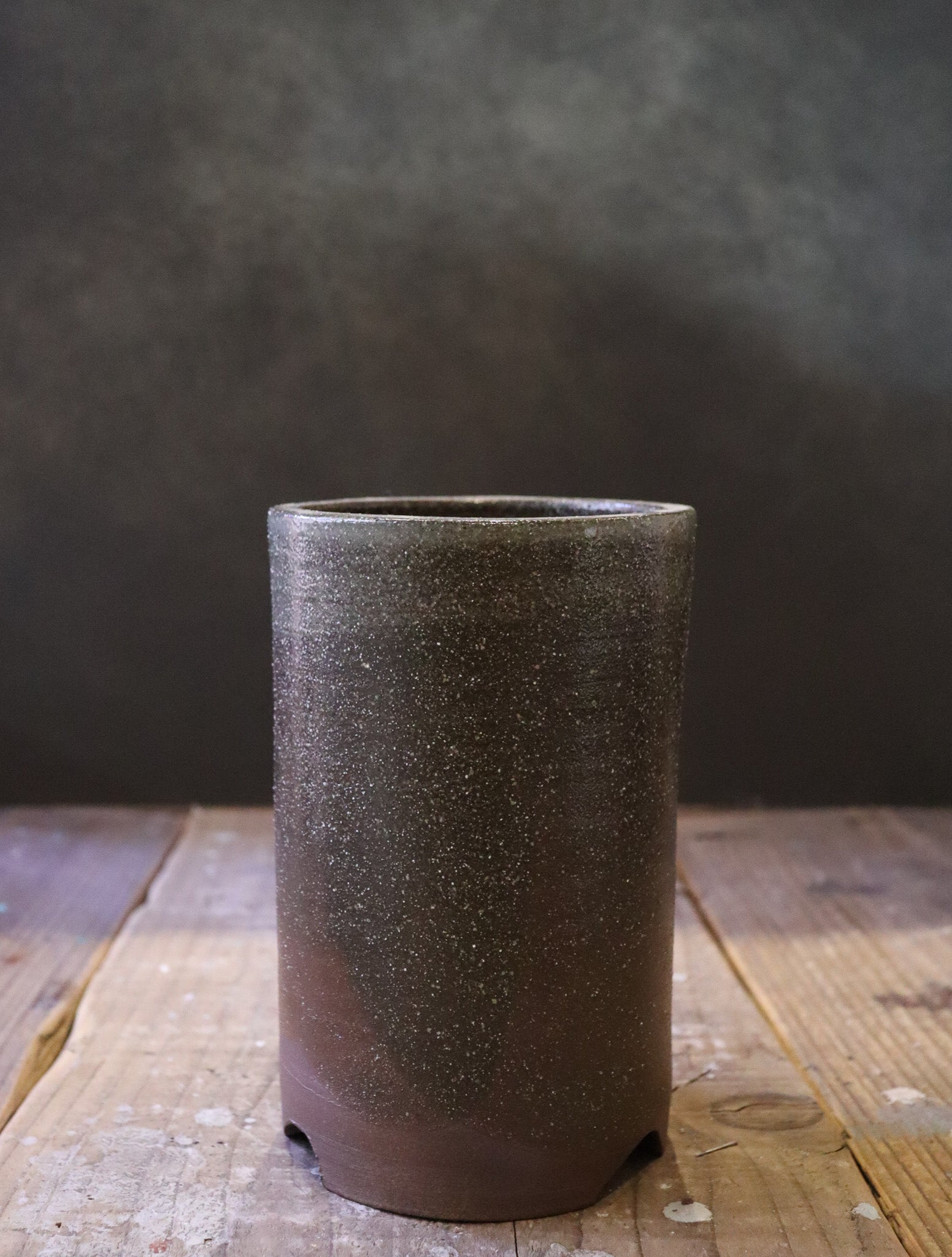 穴窯によって釉薬と焼締めされた土が光沢のあるグラデーションを纏った作品です。