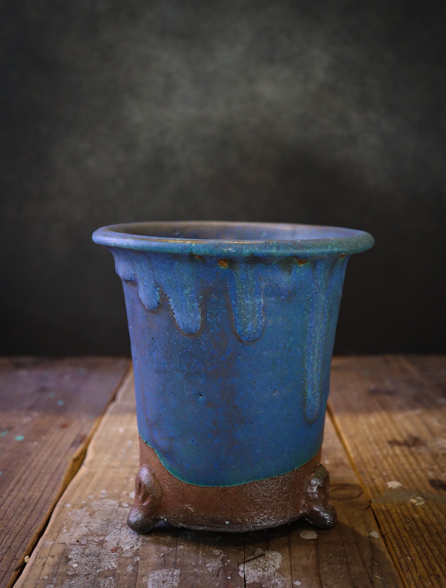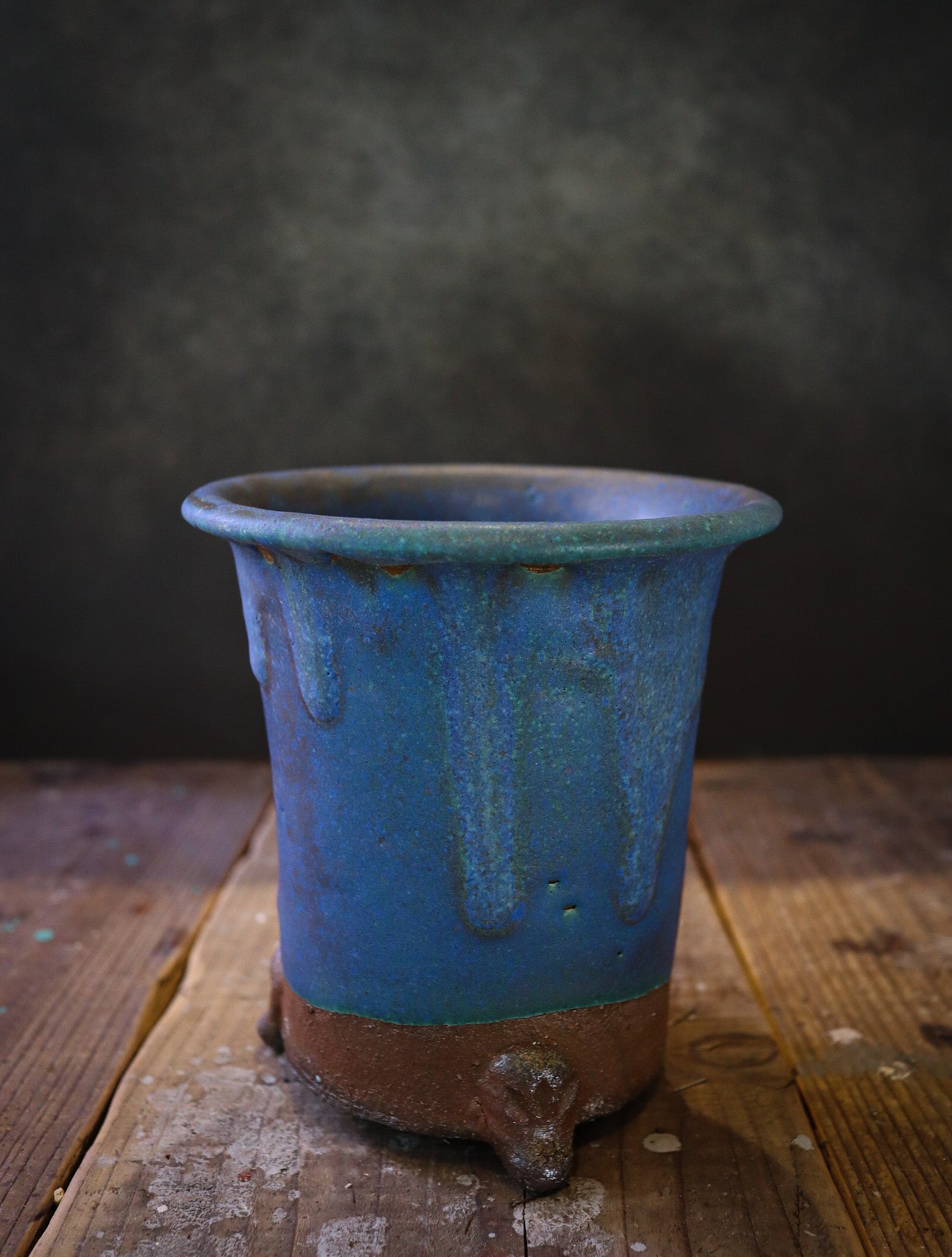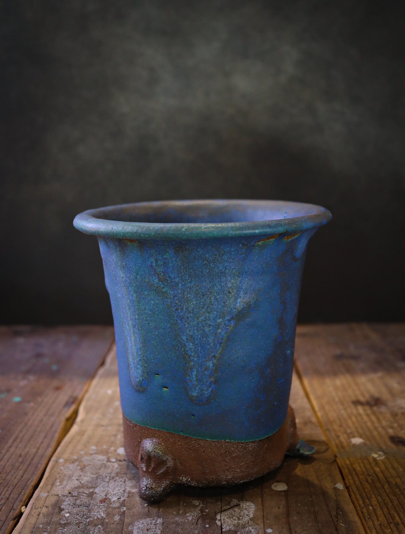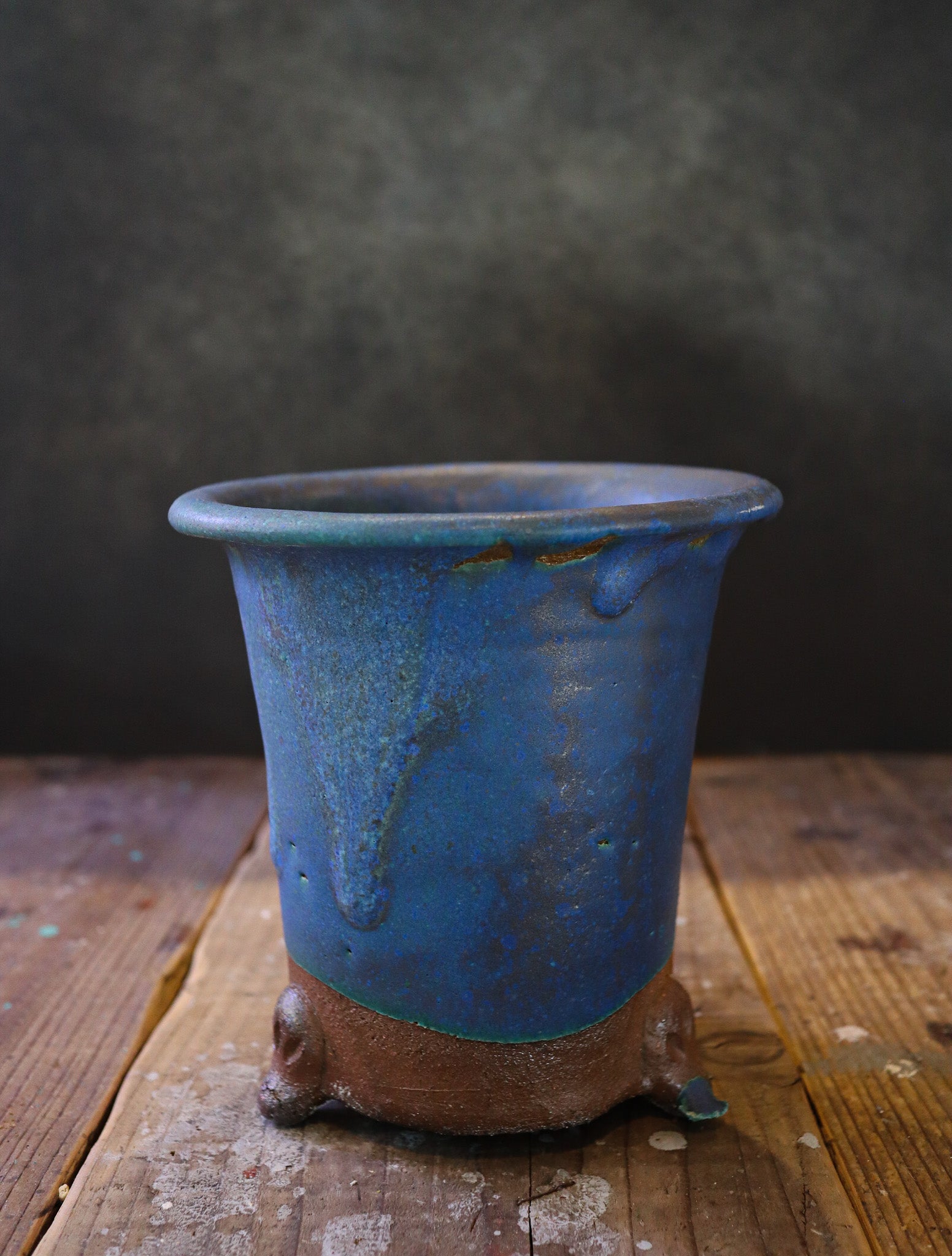 伝統的なラン鉢が穴窯によって変化した青銅の釉薬を濃く纏った作品。