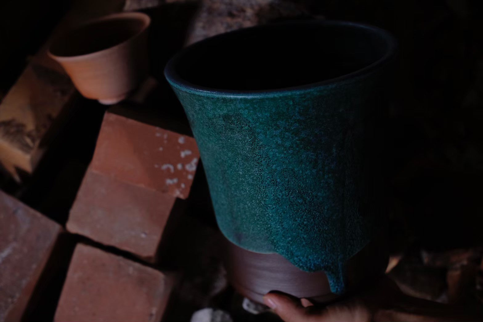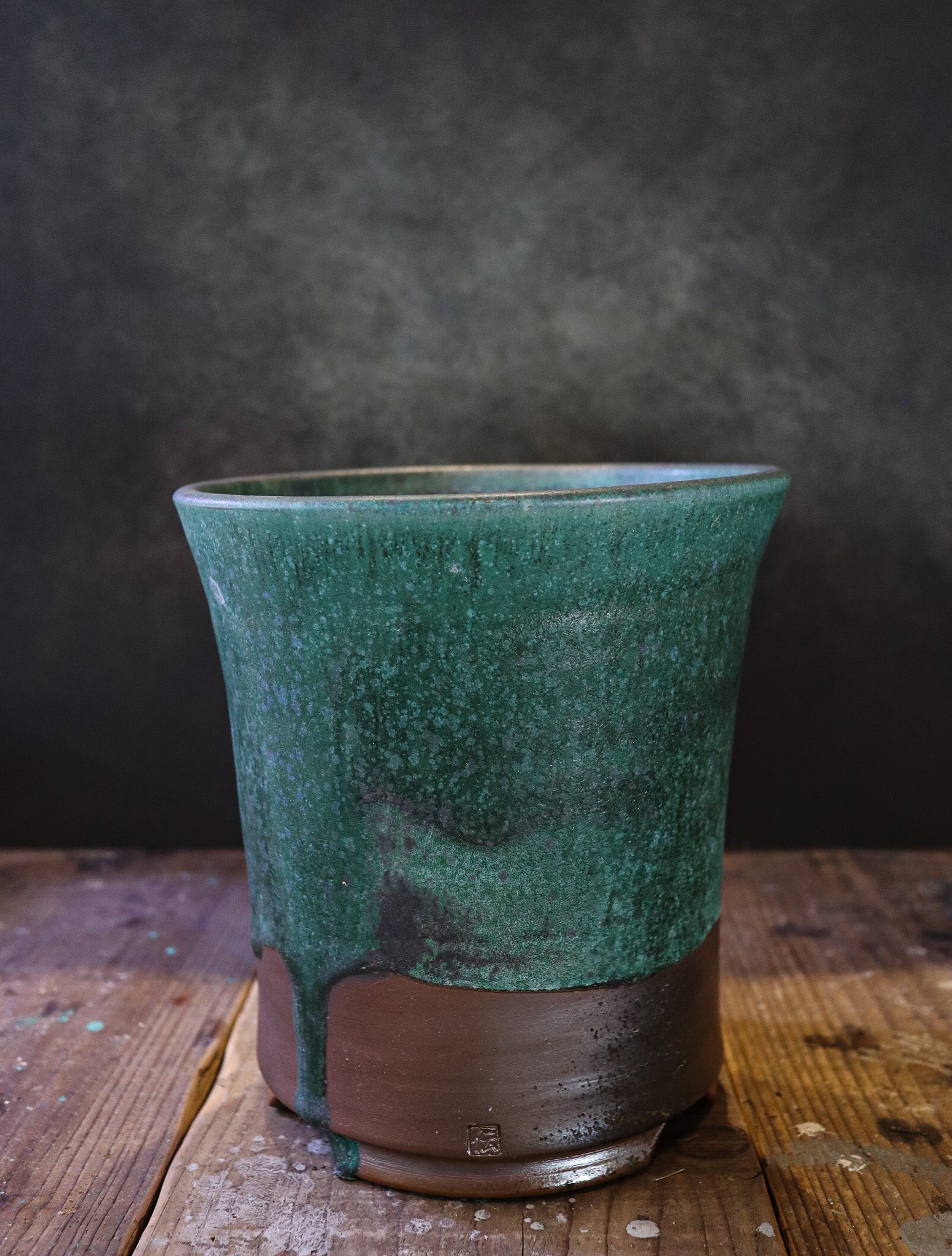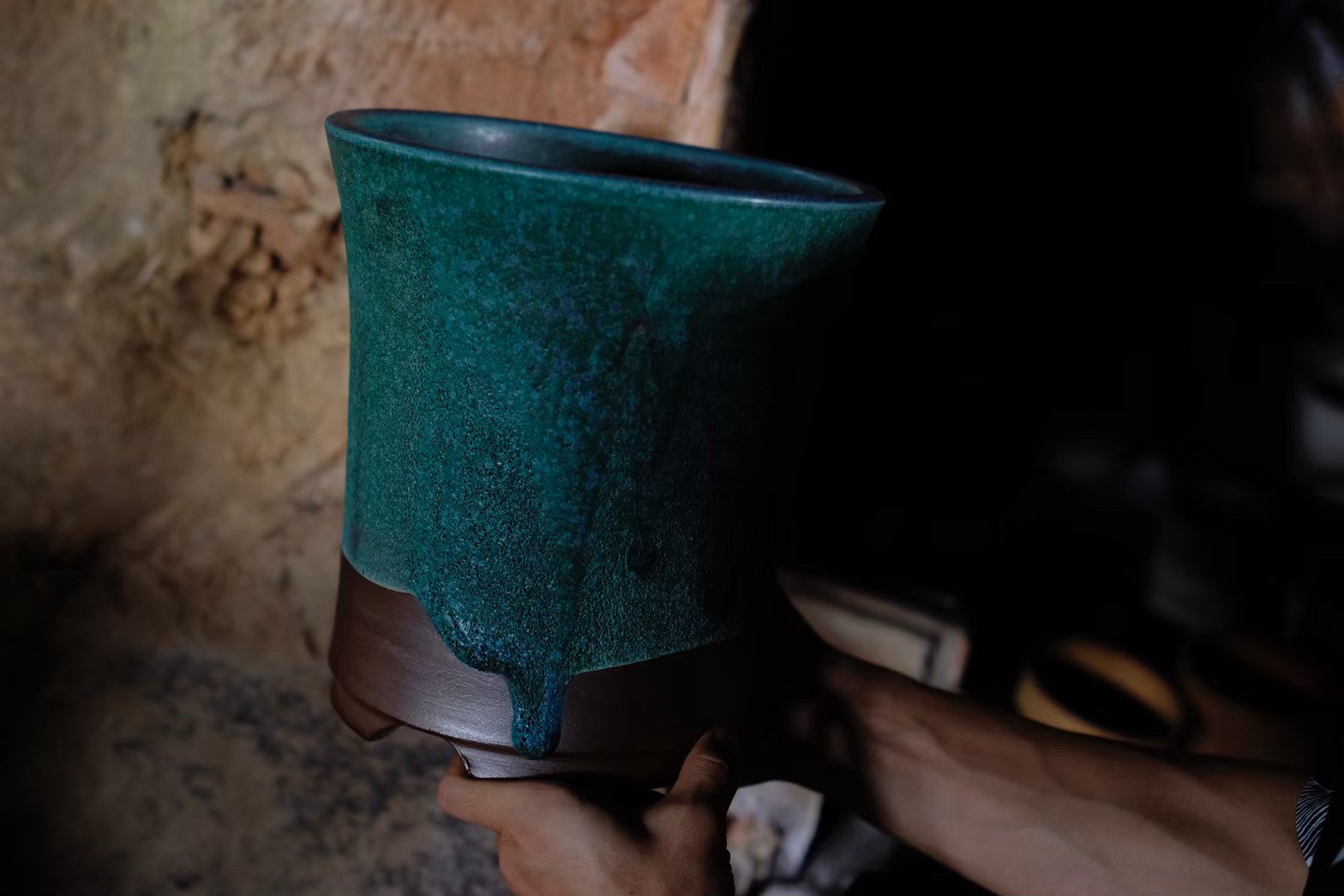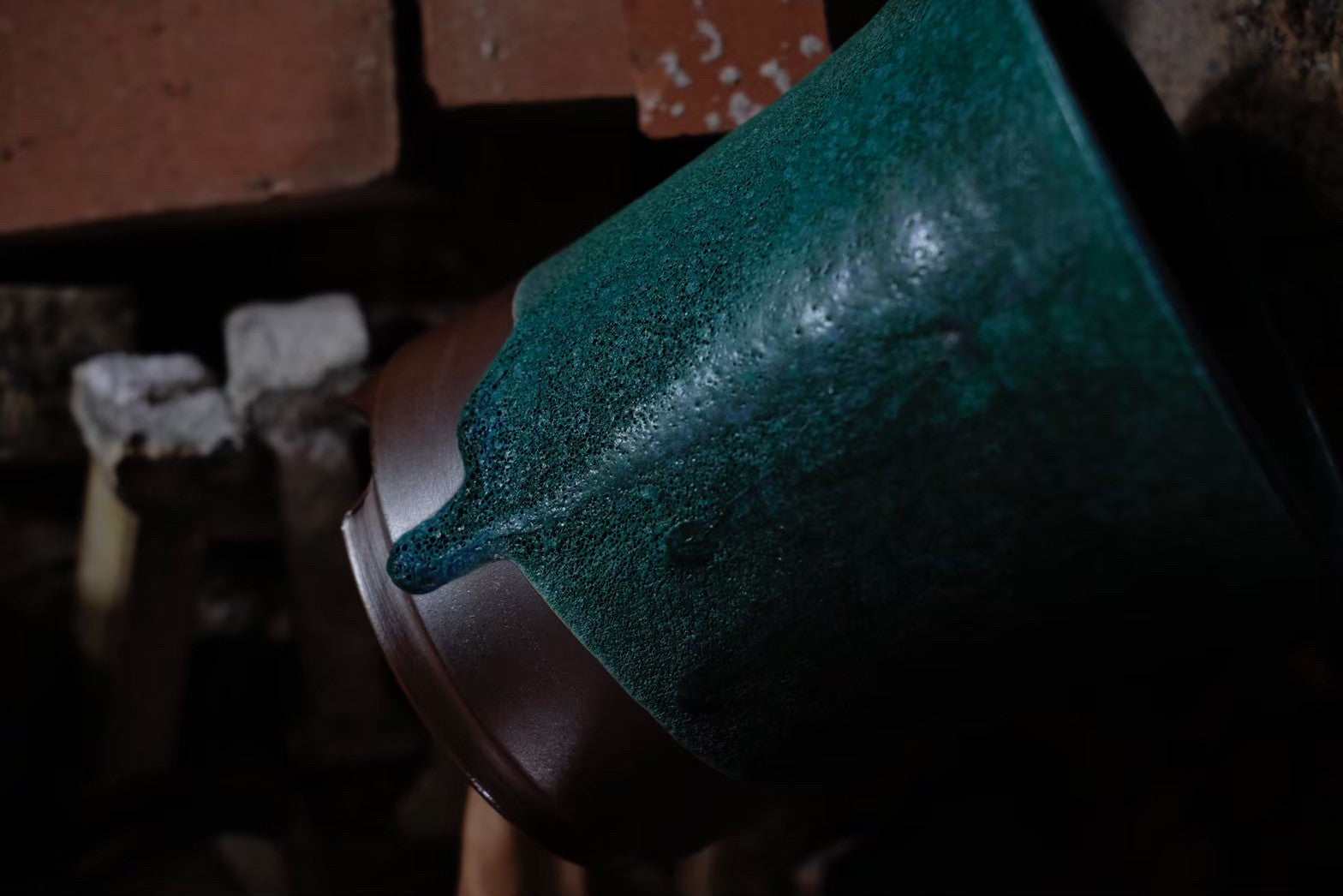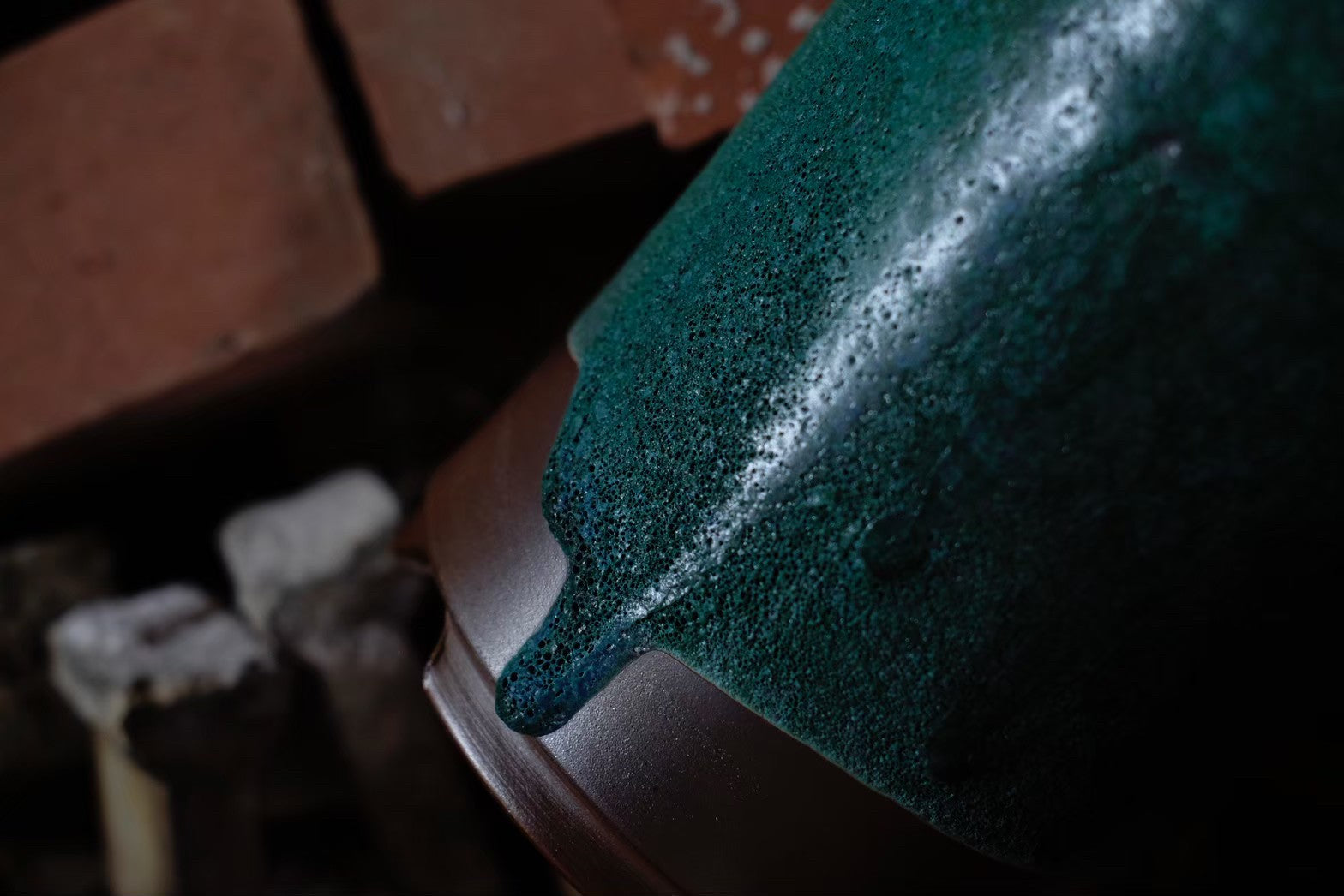 穴窯によって焼き締められた土と青銅の釉薬が独特の艶と質感を生み出した、特別な作品です。